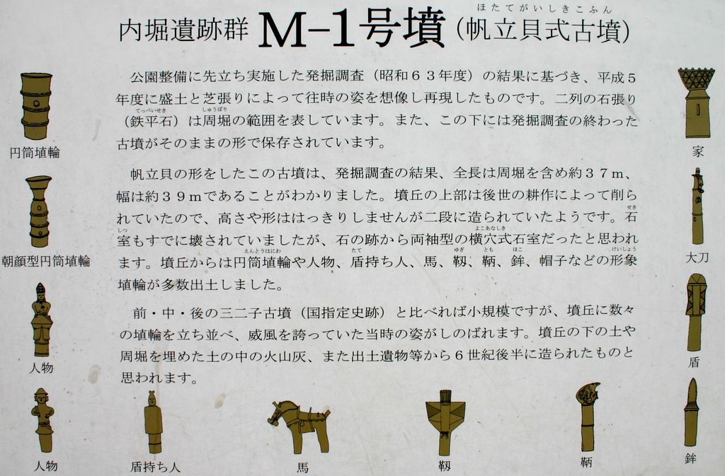 公園内に復元整備された帆立貝形の前方後円墳。6世紀後半の築造と推定されている。