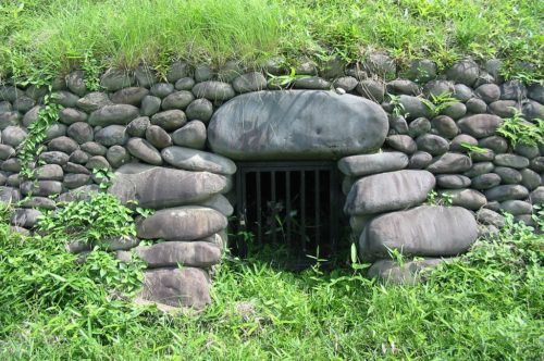 自然石乱積、両袖型の横穴式石室。墳丘はフェンスに囲われている。