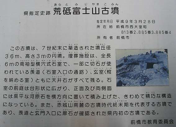 荒砥富士山古墳(荒砥村150号古墳) 円墳 径36m 高さ3m 大室町富士山 丘陵 横穴式石室、土師器、武器、土師器、須恵器、銅鋺 現地案内板、富士山I遺跡1号古墳