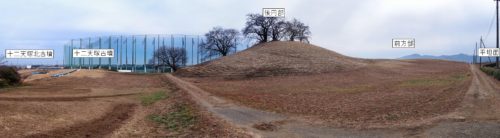 白石稲荷山古墳後円部から見る。トレンチは両古墳にまたがり設定されている。手前が十二天塚古墳、奥が十二天塚北古墳。