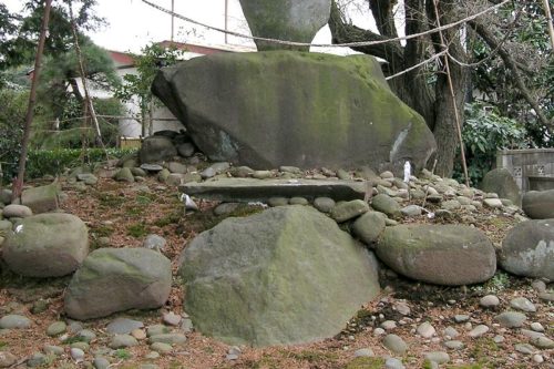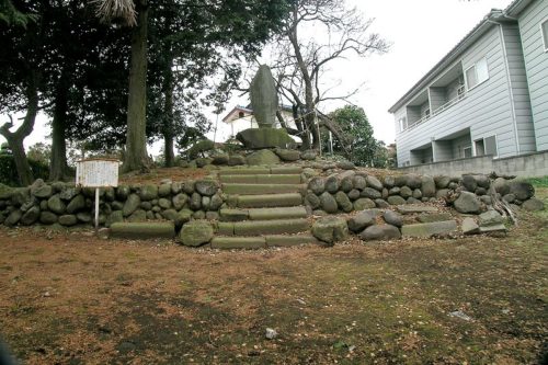 東から。御嶽神社の境内にある。石碑の台(2×1.5×0.8m)は石室材利用とのこと。ここは、現地案内板によると剣崎小路城(永正4年築城)の址らしい。