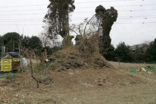 西から。綜覧では径18mとあるのでその後削られてしまったものと思われる。墳丘上に祠がある。
