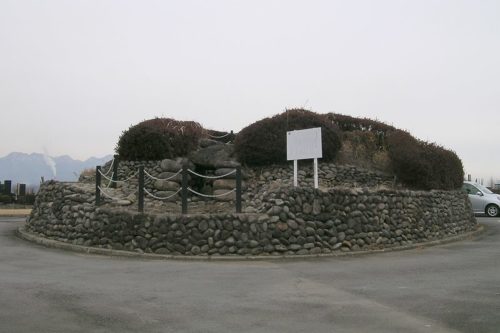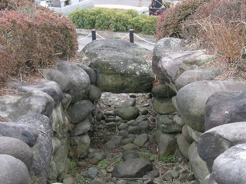 南から。八幡霊園の中央公園内にある。2段築成の円墳で埴輪を持たず7世紀後半の築造と推定されている。