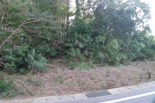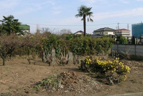 1552古墳を西から。上記民家の南東近くの墓地。棕櫚の木のあたりが古墳址ではないかと思われる。