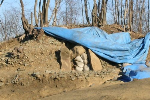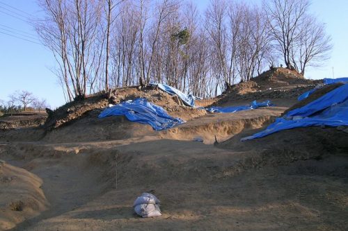 吉井ICへのアクセス道路に分布域がかかり発掘調査が行われた。左がT109、右奥がT200古墳。(2004/01)