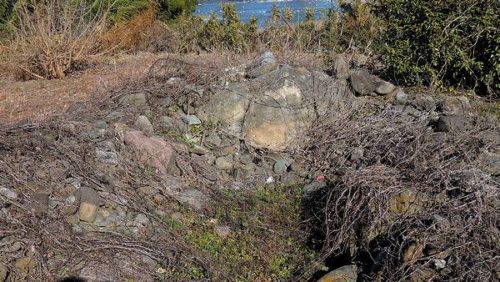 墳丘上。中央奥に石室の奥壁と思われる巨石が見える。