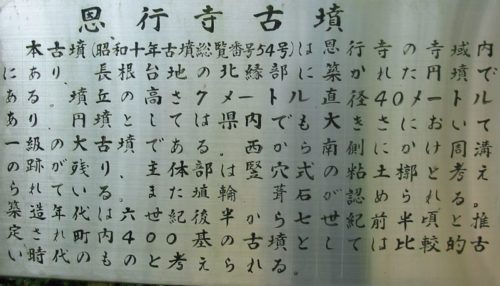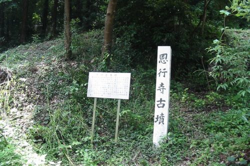 恩行寺南側の丘陵中腹に案内板と標柱がある。古墳はここではなくて山道を登りきった丘陵上。