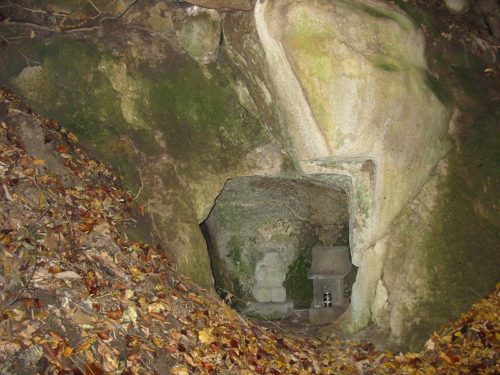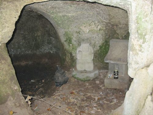 凝灰岩をくり抜いて構築された横穴墓。この地層は小暮の穴薬師まで続いているそうであるが標高はだいぶこちらのほうが高い。なんでこんな山奥にというほどの場所。