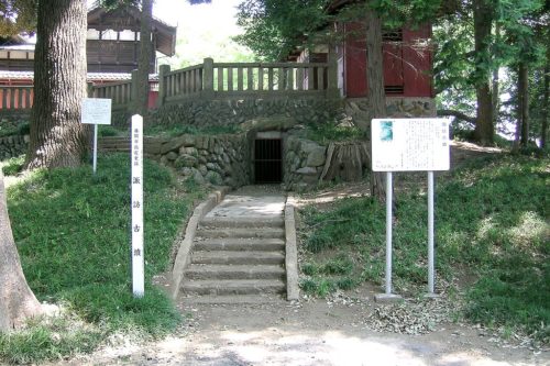 諏訪神社古墳(藤岡町3号古墳)前方後円墳 全長57m、後円部径37m、高さ4m 藤岡市藤岡 神社敷地 横穴式石室、直刀、刀子、鉄鏃、馬具、人骨、銀環、単鳳環頭太刀、衝角付冑、けい甲小礼、弓弭金具、須恵器、埴輪 現地案内板