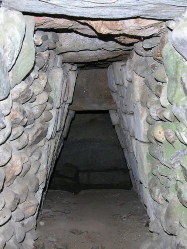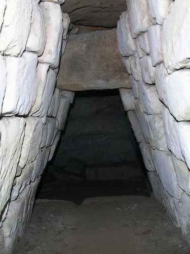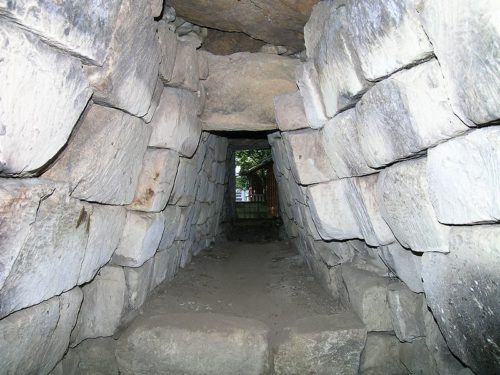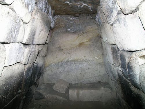 奥から外。玄室の石材は壁が凝灰岩、天井が牛伏砂岩で転びの大きい截石積。床面は羨道部より42cm低い。