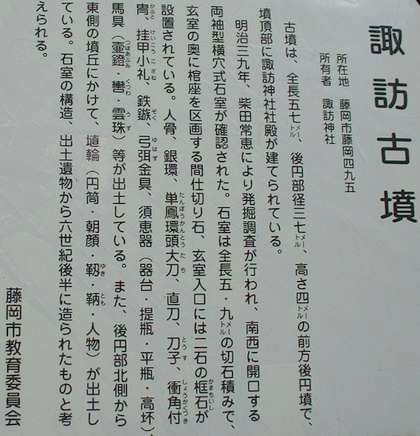 西から。6世紀後半の築造と推定されている前方後円墳。後円部上には諏訪神社社殿。石段の辺りが前方部。境内には陪塚と見られる古墳が2基ある。*注(宮司さん許可をいただき内部を見学)