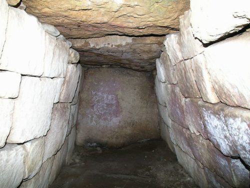 玄室。天井が牛伏砂岩、壁が凝灰岩の截石積。玄室長3.4m、奥幅1.8m、前幅1.7m、高さ1.65~1.7m。