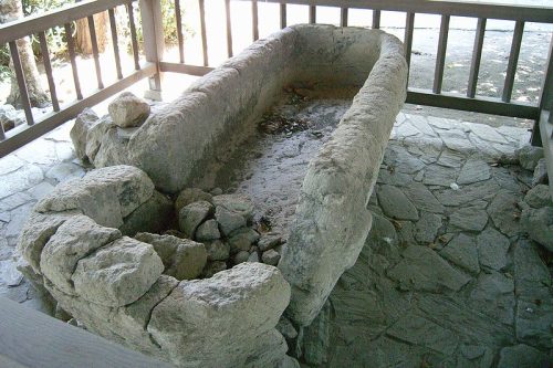 宗永寺境内にある石棺。現地案内板(石碑)によると、「…凝灰石を刳り抜いて作った舟形石棺の身部…長さ2.35m、幅86~91センチ高さ60センチ…見部の長側面には楕円形の縄掛け突起が2個ずつ付いている…」