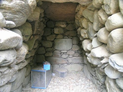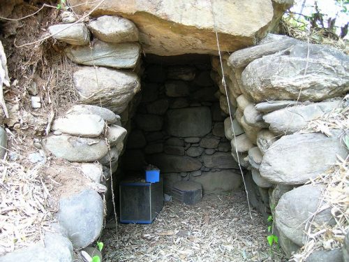玄室。側壁、奥壁ともに珪岩と片岩の河原石を用いた自然石乱石積。玄室長2.35m~2.44m、幅(前)1.36m(奥)1.55m。