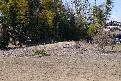 北から。畑中に低い高まりが残っている。墳丘上に数個大き目の石が見える。