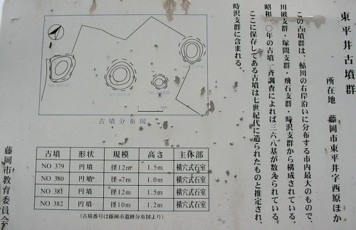 東平井古墳群は、鮎川と神流川に挟まれた藤岡台地の西南端部に分布し4支群からなる群集墳(昭和10年調査で368基、56年で約150基)です。その内の時沢支群は4支群のうち最も北よりで、市光工業北半部から北へ500m・東西500mほどの範囲に分布しています。綜覧(昭和10年調査)には20基、昭和59年調査では8基が確認されています。分布は粗く径10m内外の横穴式石室をもつ小円墳がほとんどで、6世紀後半から7世紀末にかけての築造(4支群の中では終末期)と推定されています。(資料:藤岡市史)文中の綜覧の番号は藤岡市遺跡詳細分布調査(Ⅲ)より引用。【アクセス】JR群馬藤岡駅から徒歩・自転車4.9km、駐車場有り、見学自由 ★地図★