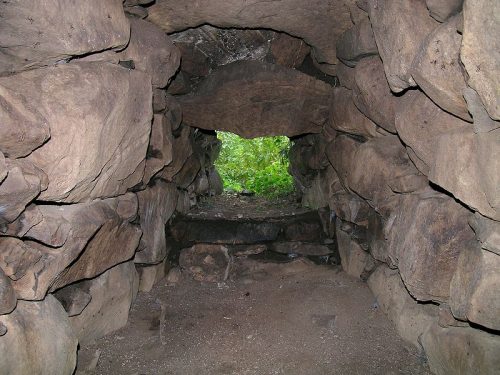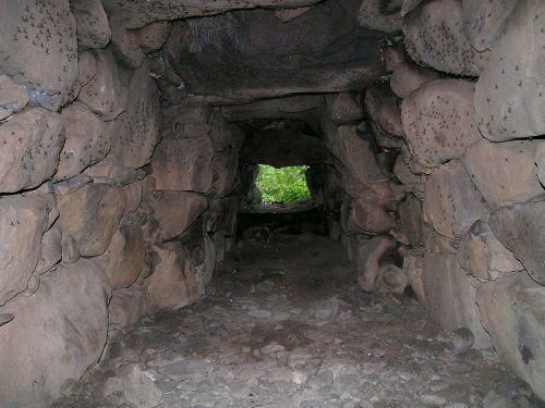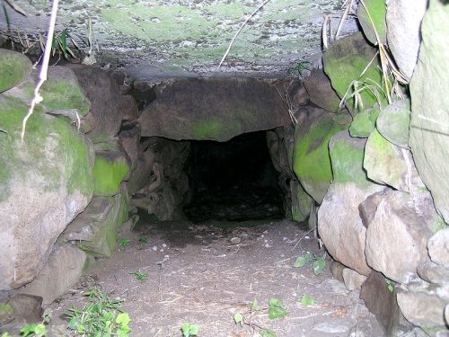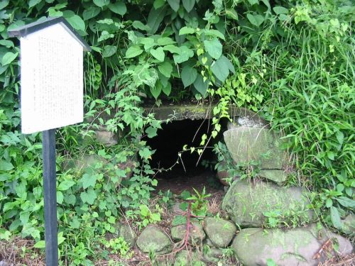 側壁は安山岩の自然石乱積。岩肌の点々はカマドウマの大群。