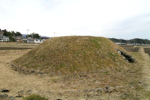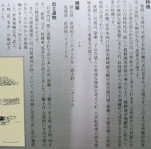 後閑3号墳(後閑村3号古墳) 円墳 基壇径約20m 墳丘部径12.6m、高さ2.2m 後閑字山王前 円筒埴輪、形象埴輪、鈴鏡、玉、鉄鏃、刀子、馬具、紡錘車、横穴式石室 現地案内板