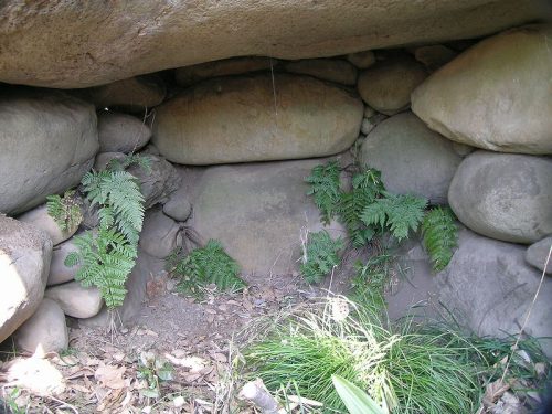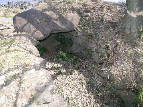自然石乱石積の無袖型横穴式石室。天井石は一つ残るのみ。