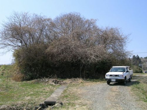 南東から。旧九十九村の東端にある。冬でも藪でよく見えないが、背の高い墳丘が残っている。7世紀初頭の築造か。