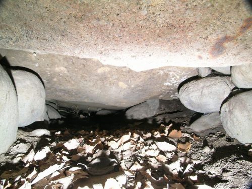 北側の奥壁の一部が崩れて中が覗けるがほとんど埋没している。自然石の乱石積。