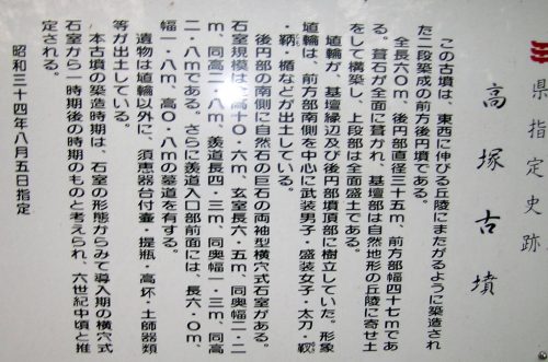 高塚古墳(桃井村45号古墳) 前方後円墳 全長60m、後円部径35m、同高さ4~5m、前方部長25m、同高さ4m 新井字高塚 丘陵 高坏、大型壷、須恵器提瓶、台付壷、金銅製耳環、鉄鏃、刀子破片、円筒埴輪、形象埴輪、横穴式石室、葺き石 現地案内板、榛東村誌、群馬県史
