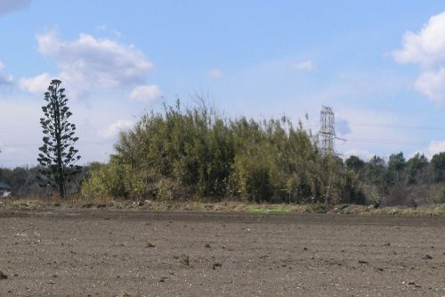 藤塚古墳。吉岡川の北側でJR上越線に近い段丘上にある。墓地分譲の看板が立っている。