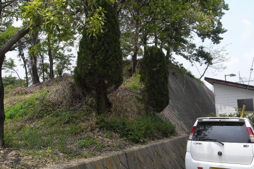 宮代古墳。A号墳の南、丘陵の先端部。古墳はこの頂部にあるらしいが墓地化で墳丘がはっきりしない。