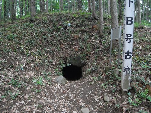 町指定史跡 南下B号古墳 本古墳は、相馬山の山体崩壊による流山とみられる丘陵上に形成された古墳群の内の1基で、周辺には本古墳を含め9基の古墳が所在している。本古墳は、この丘陵端部の南斜面中腹に山寄せされた円墳と考えられている。 墳丘規模は未調査のため明確でないが、石室前の町道南まで及んでいる可能性があり、径にして約30m、高さは約6mと推定されている。墳丘における葺き石、埴輪の設置、また周溝等の外部施設の存在については現在明らかでない。 石室は主に自然石を乱石積みした横穴式両袖型石室だが、玄室の壁面に一部削石を用いたり切組の手法を取り入れたりした部分が見られる。また羨道と玄室の境には見事に加工された重量感のある玄門が据えられている。一方の玄門上部には冠石を受けるための切り込みがつけられている。壁体の石材は腰の高さまで垂直に積まれるが、その上は大きく内側に転び天井の幅を著しく狭めている。壁面は歪や食い違いのため整正さに欠け、やや不安定な感じをうける。石材どうしの隙間には漆喰を塗りこめていたらしくその痕跡をよく残している。石室の規模は羨道が長さ3.74m、幅1.4m、高さ1.2m、玄室が長さ3.45m、幅2.5m、高さ3mあり羨道に比べ天井が極端に高い。このため羨道をくぐって玄室に入ると広々とした大きな空間に出た感じがする。 出土品については古い開口のため所在は全く判っていない。 古墳の年代は、石室構造や石材の加工からみてA・E号墳に先行する時期と考えられ、7世紀中頃の築造と推定されている。平成6年9月1日 吉岡町教育委員会 (現地案内板より)