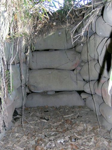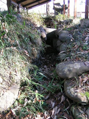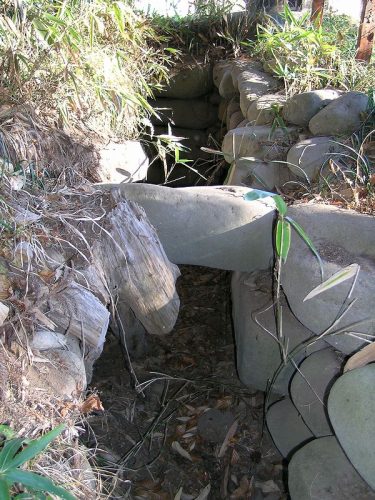 安山岩の細長い河原石を用いた乱石積の袖無型横穴式石室。
