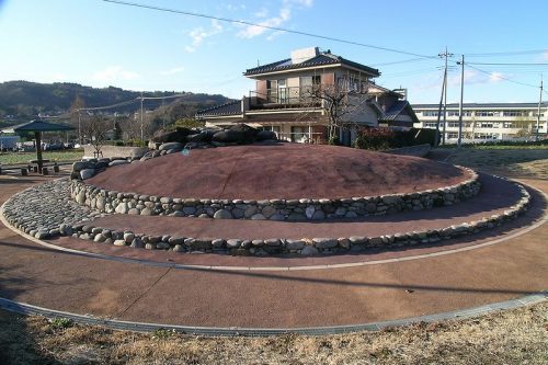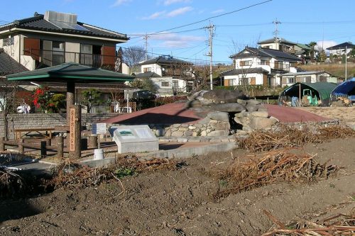 (現地案内板より) 昭和村指定史跡 鍛屋地2号古墳 指定 平成9年3月24日本古墳は、鎌川・川額地区土地改良総合整備事業に伴い、平成5年度に発掘調査した円墳である。 主体部は自然石乱石積両袖型横穴式石室で、玄室の中央より奥壁よりには強い胴張りが認められる。開口部には小口積された閉塞が確認され、天井部は奥壁よりの一枚がバランスを失った状態で残っており、ほかは石室の内外に崩落していた。奥壁は山石一枚を立てた状態であった。側壁は玄室の奥壁よりの最下段が大ぶりの石を横積み、袖寄りの最下段が平積み、羨道の最下段が平積みもしくは小口積み、床面は扁平な河原石を敷石とし、その上に玉砂利混じりの黒褐色土を敷設していた。玄室と羨道の境には、河原石の割石を二石用いて梱石としていた。 遺物は前庭部付近から須恵器、土師器などが出土し、時期としては、7世紀前半から8世紀初頭にまたがるものと考えられる。石室内からは五鈴鏡、武器類、馬具類、金属製品など300点以上も出土した。 本古墳は、古墳域(直径22.54m)・墳丘(直径19.01m)・高さ2.33m・石室(全長7.60m、側壁長左7.40m、同右7.97m)のいずれの規模も利根沼田地方で最大級である。墳丘の築造方法も根石を二重に巡らすなど手間のかかる方法をとっており、かなりの有力者によって築造されたと考えられる。 今回の工事は横穴式石室を元の状態に復元し、墳丘の復元は行わず、石室を露出した形に整備したものである。 平成11年12月20日 昭和村教育委員会