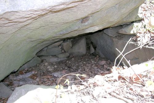 尾根上で見つけた1基(池田村42号古墳か)。天井石が露出。この尾根から東を見下ろすと奈良古墳群が一望できる。