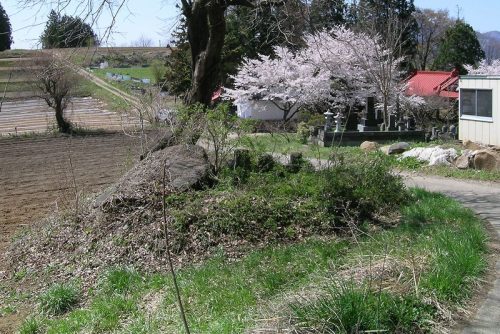 字峯の神社北側で見つけた1基(池田村43号古墳か)。天井石が露出している。岡谷町字峯・十二に分布する古墳をマッピングぐんまでは「峯山古墳群」、沼田市史では「岡谷古墳群」としている。市史では古墳時代後期群集墳としている。