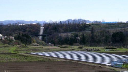 北西の丘陵から。薄根川の段丘上に築かれた群集墳。