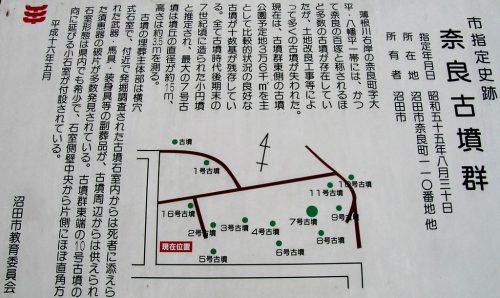 奈良古墳群は、薄根川(利根川の支流)中流域の河岸段丘上に分布する群集墳です。59基が確認されていますが現在16基程度が残っているだけです。1955年に発掘調査された古墳は、埋葬施設は割石を多用した自然石乱石積の横穴式石室で、直刀、鉄鏃の武器類、轡、鐙、杏葉などの馬具類、耳環、玉類などの装身具類が出土しています。榛名山二ツ岳の噴火の軽石層上に構築されていることなどから7世紀中葉から8世紀前半にかけて築造されたものと推定されます。【アクセス】JR沼田駅から徒歩・自転車5.5km、駐車場有 ★地図★