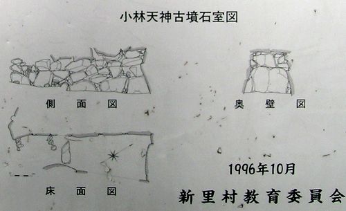(現地案内板より)小林天神古墳 桐生市指定史跡天神古墳は、別名天神山古墳とも呼ばれ、かつて墳丘上に天神様がまつられていていたことからこの名前を残している。昭和10年の県下古墳一斉調査の際には、村内に残る代表的な古墳のひとつとして、桐生市1号墳に指定されている。墳丘は、北側が現在道路により削られているものの、本来は直径42m、高さ3mの規模を有する円墳であったと推定される。周囲には幅4mの周溝が巡らされており、盛土は2段に築成され、葺き石は存在しない。基壇面には埴輪円筒列が盛土の周囲を囲繞していた。埋葬主体部は横穴式袖無型石室で、昭和初期に開墾により開かれた。石材には付近で産出する輝石安山岩を使用し、自然石乱石積で墳丘南側に開口していた。全長6.4mで、入口から奥へ2.8mの位置に長径38cmの框石が設けられ、羨道部と玄室部を区画していた。遺体の埋葬された玄室は長さ3.6mで、羨道部よりも1段下がって構築されている。石室内から副葬品として鉄刀2振、金環9個、丸玉50個、鉄鏃、須恵器等が出土している。墳丘上からは円筒埴輪のほか、家形埴輪,鞆形埴輪、人物埴輪頭部等が出土しており、家形埴輪は現在、東京国立博物館に所蔵されている。 1996年 桐生市教育委員会