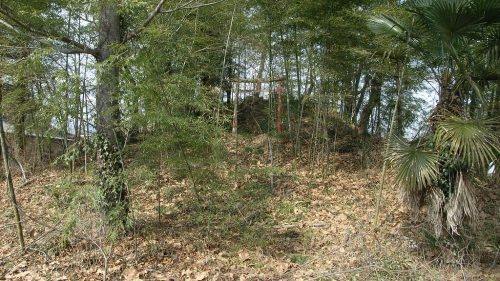 東から。墳頂には祠が祀られている。石室は開口しているわけではないが、控え積みの一部が露出しているそうである。