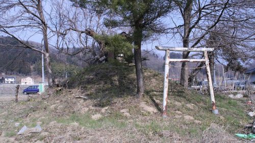 南から。お塚権現が祀られている。1992年に測量調査が行われ上円下方形をしていることが判明した。しかし周溝の痕跡は無く遺物等は発見されておらず古墳とは断定されていないようだ。