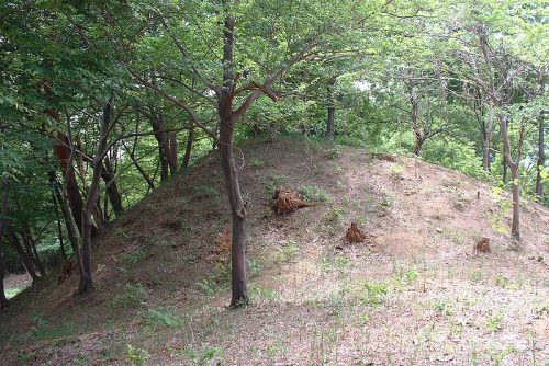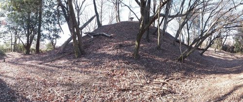 北東から。中央が後円部、右奥が前方部。周溝もみてとれる。白岩神社のある山の頂上付近にあるが、神社からは行けないので注意。山の東側の道を登ると頂上付近に案内板がでている。町指定史跡。