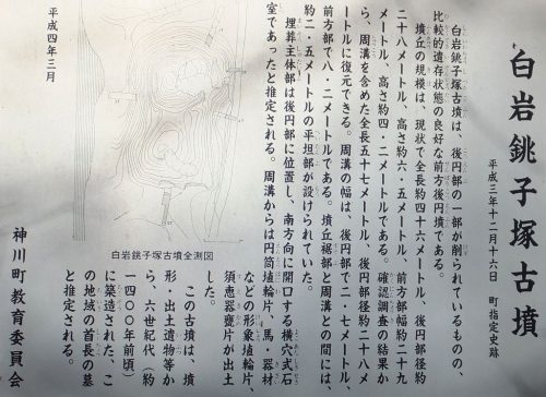 白岩銚子塚古墳 前方後円墳 全長46m、後円部径28m、高さ6.5m、前方部幅11m、高さ4.2m 新里字白岩附 丘陵、山林 円筒埴輪、形象埴輪、須恵器 案内板