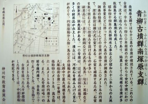 青柳古墳群は、神流川東側の段丘上に築かれています。9支群に分けられ、かつては200以上の古墳が存在したとされています。築造年代は6世紀~7世紀後半。南塚原支群は、神川中学校の南側にあり、開墾などで多くが消滅しましたがまだ大塚稲荷古墳を中心に数基が畑の中などに残っています。【アクセス】JR丹荘駅から徒歩・自転車2.3km、駐車場無し ★地図★