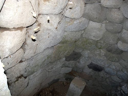 玄室。左が奥壁。角閃石安山岩を使用した胴張りで、全長9.48mの両袖型横穴式石室。
