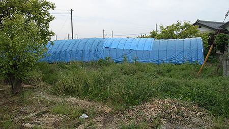 推定9号墳。分布図の位置には古墳らしきマウンドは見当たらない。ビニールハウスの下が不自然に盛り上がっているのでこれが9号墳か。