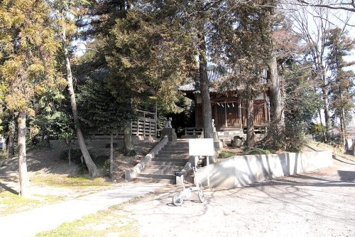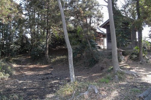 西から。こちら側には池がある。宮司様のご教示によると、本来の墳丘は現在より小さく本殿の下が本来の墳丘で他は西側の池を掘って盛り土したものだとのこと。
