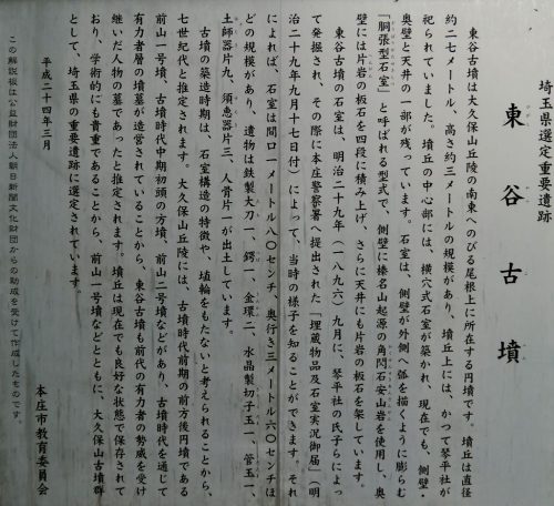 本庄市東谷古墳 80埼玉県, ほ_本庄市, 旧ほ_本庄市 コメントを追加 7月 162025 大久保山古墳群は、本庄早稲田高校のある丘陵の東寄りに分布しています。古墳名 墳形 規模 所在地 立地 出土品、備考 引用東谷古墳 方墳 27m 栗崎字東谷 丘陵・山林 横穴式石室 埼玉県古墳詳細分布調査報告書 本庄早稲田高校の南側入口脇の藪の中にある。 南西向きに石室が開口。 ほとんど奥行が無い。奥壁付近のみ残っているのであろうか。 2024年再訪。案内板が設置されていた。 (撮影 2005/01) 返信する 返信をやめる Your Comment 以下のHTML タグと属性が利用できます: <a href="" title=""> <abbr title=""> <acronym title=""> <b> <blockquote cite=""> <cite> <code> <del datetime=""> <em> <i> <q cite=""> <s> <strike> <strong> Name (required) E-mail (required) URI 次回のコメントで使用するためブラウザーに自分の名前、メールアドレス、サイトを保存する。