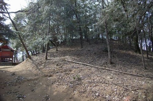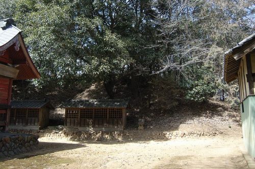 社殿裏に残る墳丘。類例の少ない「叩き目」のある円筒埴輪が出土している。主体部は箱式石棺と考えられ、参道の敷石や石碑などに利用されている。