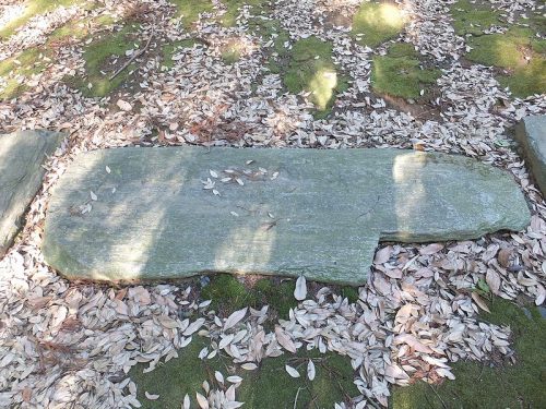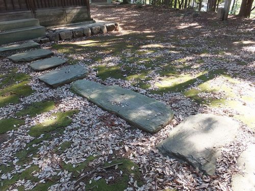社殿前の踏み石。本古墳出土の組合い式箱形石棺の部材を利用。