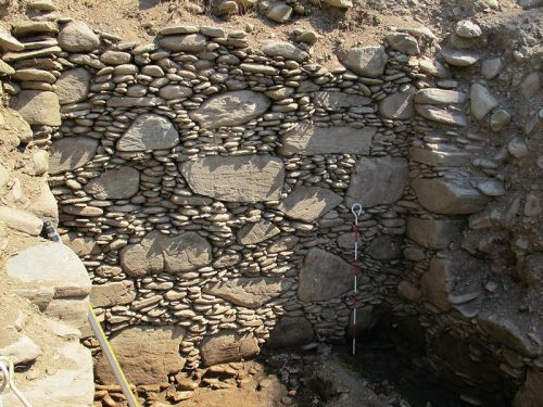 基壇が巡り葺石(写真手前)がj施されている。奥の石積みは横穴式石室の控え積。墳丘から埴輪片を多く検出。6世紀後半の築造と推定されている。(本墳は調査後消滅しています。)