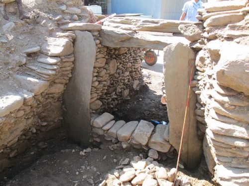 奥から。玄門は板状の緑泥片岩を立てて門柱石にしている。