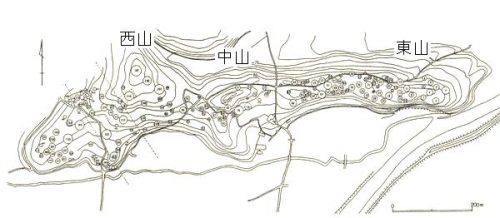 分布図。発掘調査の結果、主体部として模様詰みの「毛野型胴張り石室」が検出された。また周溝墓も検出されている。埴輪を持つ古墳は現在までに9基が知られているのみで数はすくない。5世紀後半から8世紀初頭にかけて築造された群集墳と考えられ、その盛行期は6世紀末から7世紀後半と推定されている。